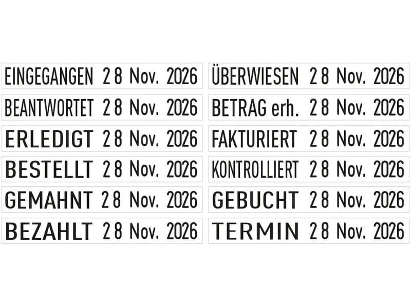 Ein Stempel für alle wichtigen Geschäftsvorfälle? Der Lagertext Wortbandstempel Trodat Classic mit Datumsangabe verfügt über ein vielfältiges Spektrum an wichtigen buchhalterischen Begriffen wie zum Beispiel Eingegangen, Beantwortet, Gemahnt und Bezahlt. Unter dem jeweils ausgewählten Begriff lässt sich das aktuelle Datum einstellen. Der Trodat-Stempel erleichtert die internen Prozesse und kann zu einer optimalen Auslastung der Ressourcen führen. So wird in den Unterlagen jeder Geschäftsvorgang klar und deutlich vermerkt und erfüllen die Grundlagen ordnungsgemäßer Buchführung.