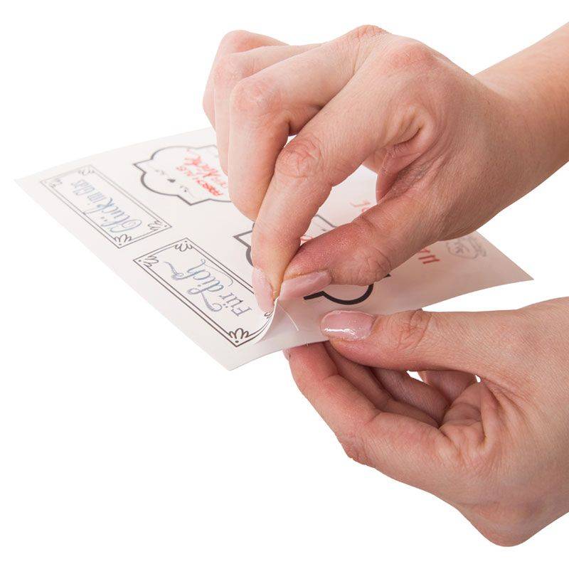 Zum Stempelset gehören außerdem 12 selbstklebende und wasserfeste Etiketten in 3 Designs sowie ein Stempelkissen mit 3 unterschiedlichen Farben: