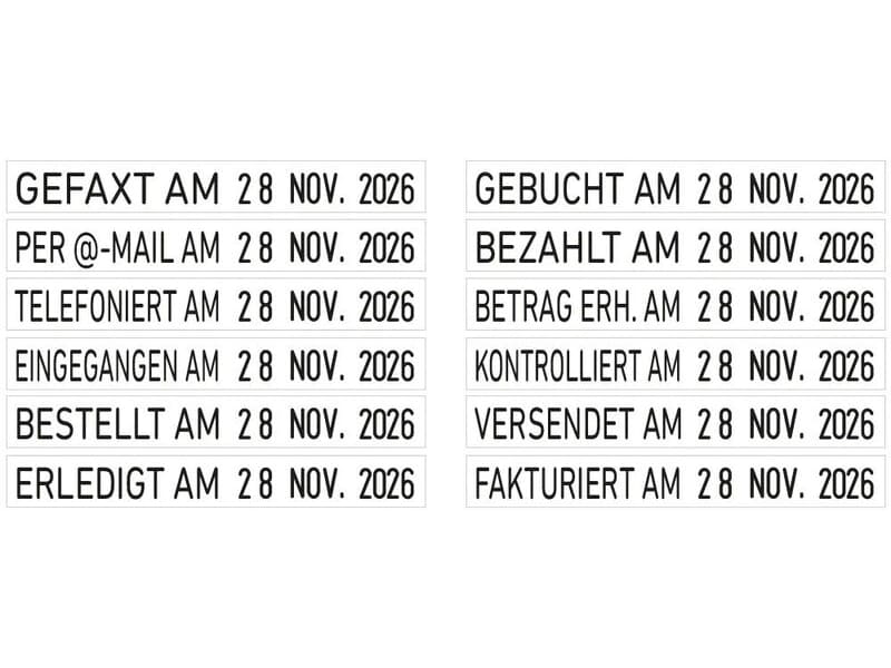 Der Trodat Printy Dater 4817 ist eine gelungene Verbindung zwischen einem herkömmlichen Datumsstempel und der individuellen Gestaltung des Stempelkissens. Denn neben den Angaben für Tag, Monat und Jahr, die man auf einem Datumsstempel immer findet, gibt es beim Trodat Printy Dater 4817 zusätzlich ein Textband. Dieses Textband befindet sich beim Trodat Printy Dater 4817 vor der Datumsangabe und bietet Textbausteine wie "Erledigt am" oder "Eingegangen am". Insgesamt findet man auf dem Textband 12 verschiedene Texte, die ein breites Standardspektrum abdecken. So ist es möglich, mit einem einzigen Stempel verschiedene Funktionen und Aufgaben zu erfüllen. Das Textband ermöglicht eine schnelle und effiziente Kennzeichnung aller Dokumente mit dem jeweiligen Vermerk. Der Trodat Printy Dater 4817 bietet zudem mehrere Stempelfarben, sodass ein individuelles Druckbild entsteht.