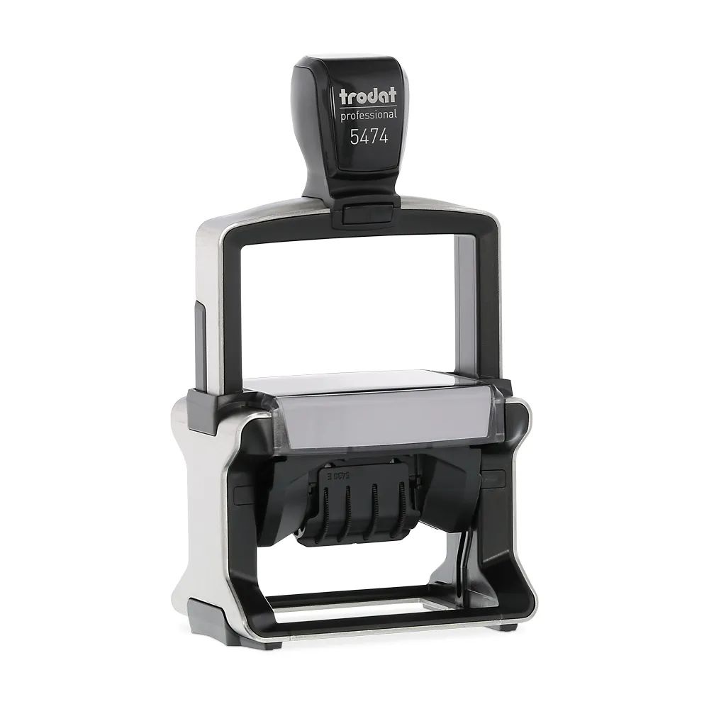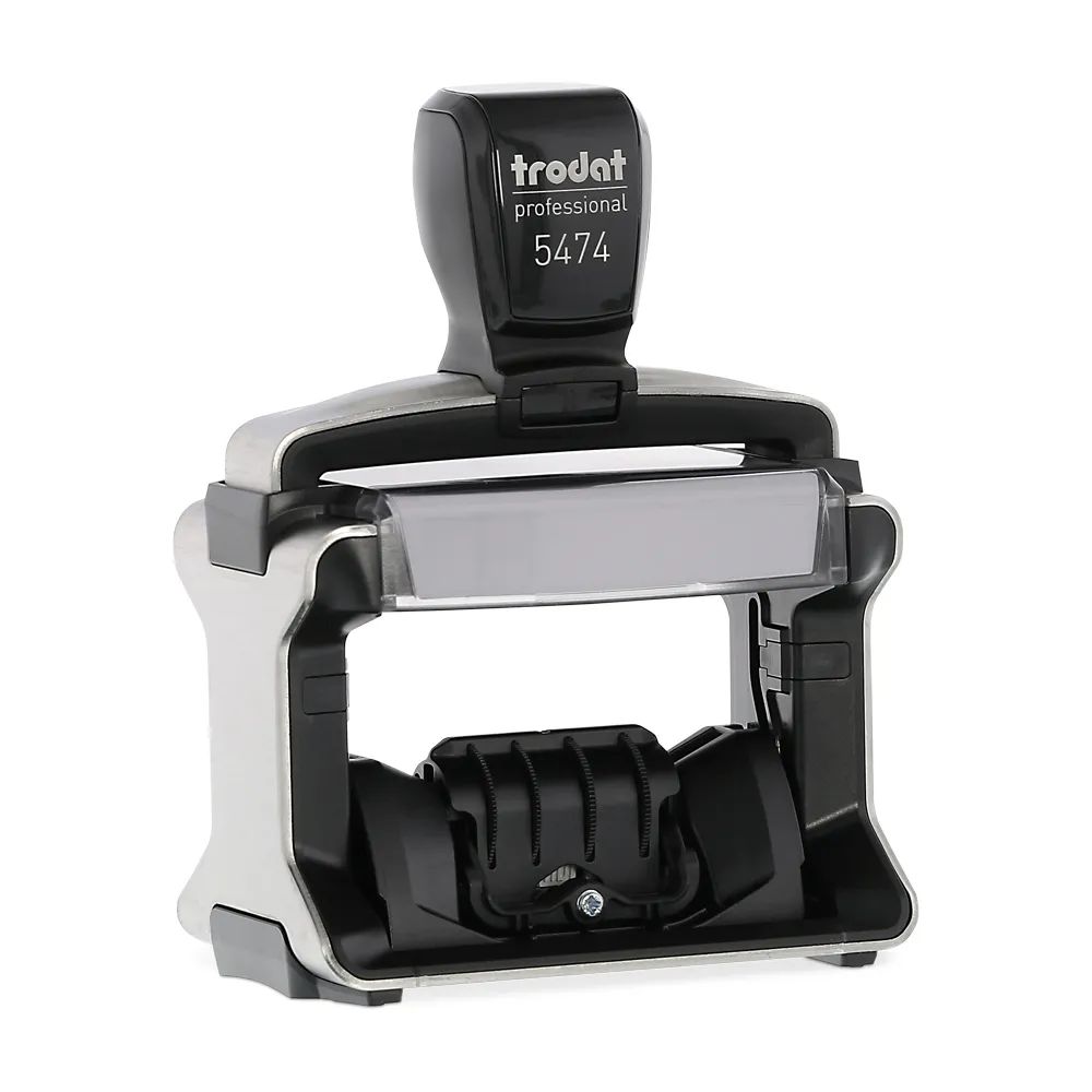Der Trodat Professional Dater 5474 hat eine rechteckige Abdruckfläche von 60 x 40 mm. Mit dem integrierten Jahresband, dass für 12 Jahre reicht können Tag, Monat und Jahr eingestellt werden. Außerdem lassen sich bis zu 8 Zeilen individuell mit unserem Stempeldesigner gestalten. Der Trodat Professional bietet höchsten Bedienkomfort und liegt dank ergonomisch geformtem Griff optimal in der Hand. Der garantiert saubere und präzise Abdruck erfolgt in einer weichen, runden Stempelbewegung. Der robuste Stahlkern garantiert eine extrem lange Lebensdauer und höchste Stabilität für die vielfältigen Anforderungen im Büroalltag. Ein Kissenwechsel ist ohne Berühren des Farbspeichers möglich und durch die Bandabdeckung bleiben bei der täglichen Datumseinstellung die Finger sauber.